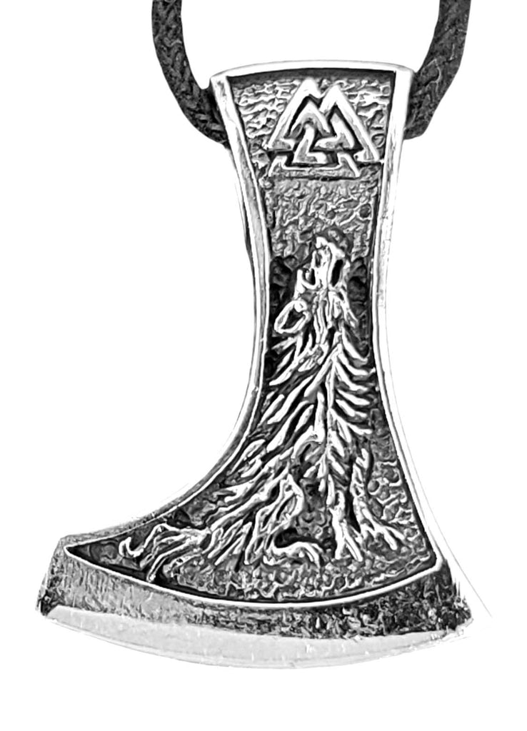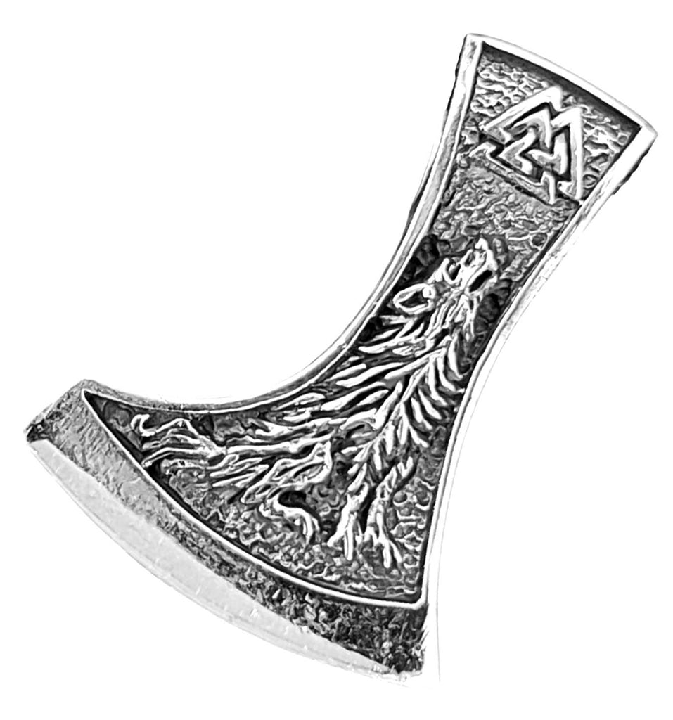 Kunstvoll gestaltete Wikingeraxt aus 925 Sterling Silber. Das Axtblatt ist auf der Vorderseite mit einem heulenden Wolf verziert, auf der Rückseite mit einem Raben. Beide Seiten der Öse ziert ein Wotansknoten. Der Kettenanhänger ist teilweise geschwärzt, sodass das Design optimal zur Geltung kommt. Er eignet sich für Damen und Herren.
