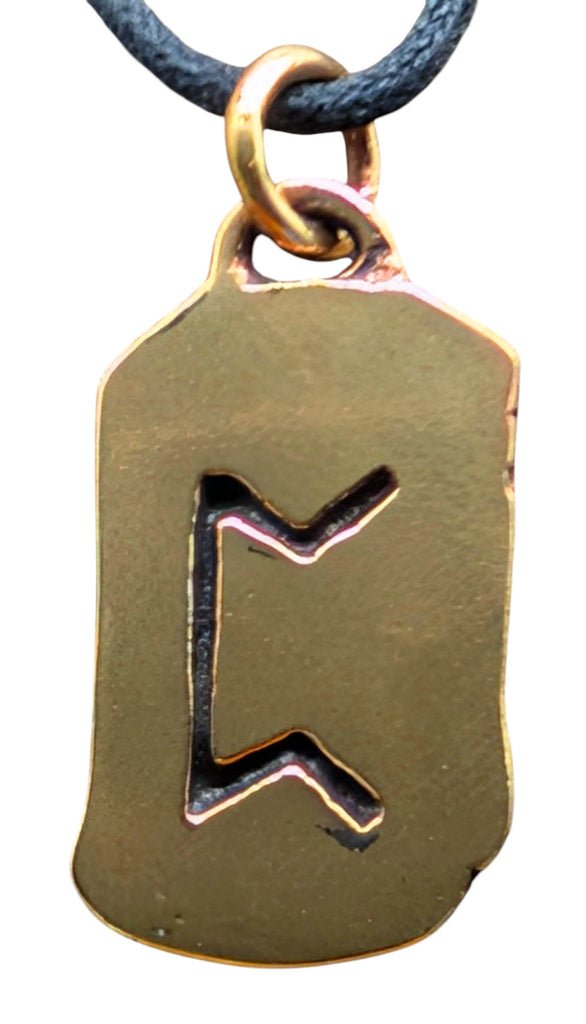 Kunstvoll gestaltetes Amulett aus Bronze mit eingravierter Perthro-Rune auf der Vorderseite. Die Rückseite ist glatt poliert.