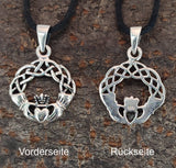 Kunstvoll gestalteter Kettenanhänger "Claddagh" aus 925 Sterling Silber. Der Anhänger ist auf der Vorderseite teilweise geschwärzt, die Rückseite ist glatt poliert.