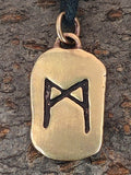 Kunstvoll gestaltetes Amulett aus Bronze mit eingravierter Mannaz-Rune auf der Vorderseite. Die Rückseite ist glatt poliert.