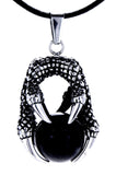 Kunstvoll gestaltete, dreidimensionale Drachenkralle aus Edelstahl mit schwarzer Kugel. Der Kettenanhänger ist teilweise geschwärzt. Die Kralle ist auf Vorder- und Rückseite gleichermaßen sorgfältig ausgearbeitet, lässt sich also beidseitig tragen.