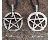 Kunstvoll gestalteter Anhänger aus Zinn/Pewter, Motiv "Pentagramm". Der Kettenanhänger ist teilweise geschwärzt. Das Pentagramm ist von einem schlichten Ring umgeben.