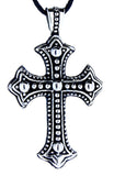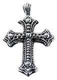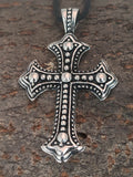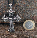 Kunstvoll verziertes Kreuz aus Edelstahl. Der Kettenanhänger ist auf der Vorderseite teilweise geschwärzt, die Rückseite ist glatt poliert.