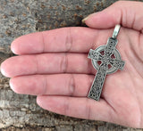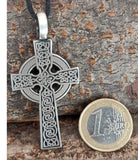 kunstvoll gestaltetes keltisches Kreuz aus Zinn. Der Kettenanhänger ist auf der Vorderseite teilweise geschwärzt, sodass das Knotenmuster optimal zur Geltung kommt.