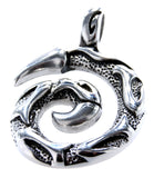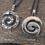 Kunstvoll gestaltete Drachenkrallen-Spirale aus Edelstahl. Der Kettenanhänger ist auf der Vorderseite teilweise geschwärzt, die Rückseite ist glatt poliert.