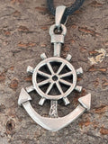 Kunstvoll gestaltete Kombination aus Anker und Steuerrad aus Zinn/Pewter. Der Kettenanhänger ist teilweise geschwärzt.