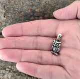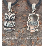 Kunstvoll gestaltete Eule aus 925 Sterling Silber. Der Kettenanhänger ist auf der Vorderseite teilweise geschwärzt.