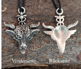 Kunstvoll gestalteter Anhänger aus Zinn/Pewter, Motiv "Ziegenkopf". Die Stirn der Ziege ziert ein Pentagramm. Der Kettenanhänger ist teilweise geschwärzt.