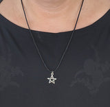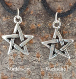 Zierliches, kunstvoll gestaltetes Pentagramm aus 925 Sterling Silber. Der Kettenanhänger ist auf Vorder- und Rückseite gleichermaßen sorgfältig ausgearbeitet und teilweise geschwärzt, sodass er sich beidseitig tragen lässt.