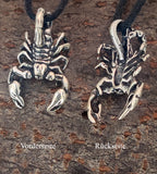 Massiver, plastisch gestalteter Skorpion aus 925 Sterling Silber. Der Kettenanhänger ist beidseitig teilweise geschwärzt, sodass die sorgfältig ausgearbeiteten Details optimal zur Geltung kommen. Die Öse ist kunstvoll in den Schwanz mit eingearbeitet.