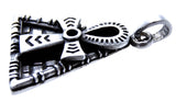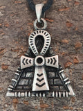 Kunstvoll gestaltetes Ankh mit Pyramide aus Zinn / Pewter. Der Kettenanhänger ist auf der Vorderseite teilweise geschwärzt, die Rückseite ist glatt poliert.