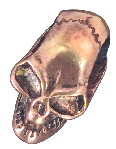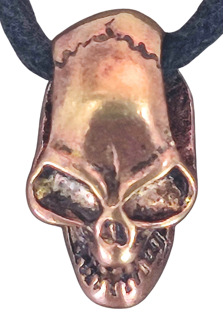 Aufwändig gestalteter, dreidimensionaler Totenkopf aus massiver Bronze. Der Kettenanhänger ist teilweise geschwärzt, sodass die Details des Schädels optimal zur Geltung kommen. Die Öse führt quer durch den Schädel hindurch.