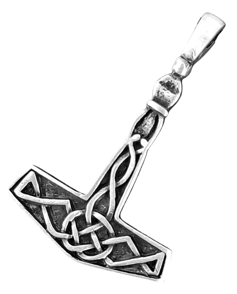 Kunstvoll gestalteter Kettenanhänger "Thorshammer" aus Zinn. Der Hammer ist auf der Vorderseite mit einem Knotenmuster verziert, die Rückseite ist glatt poliert.