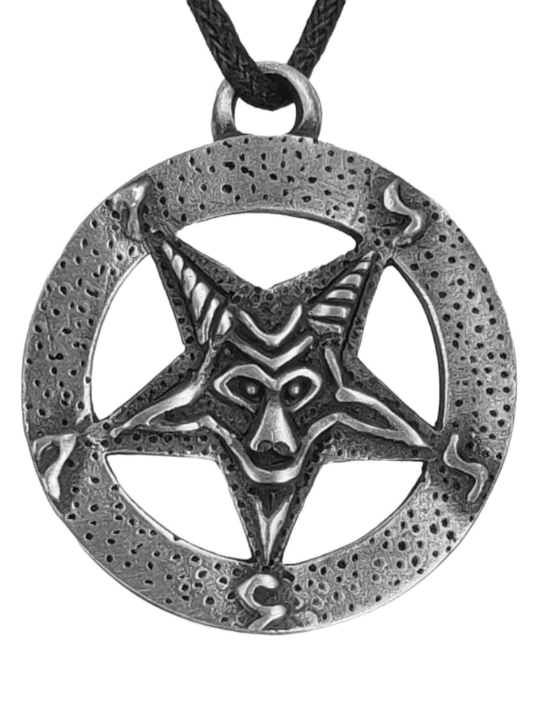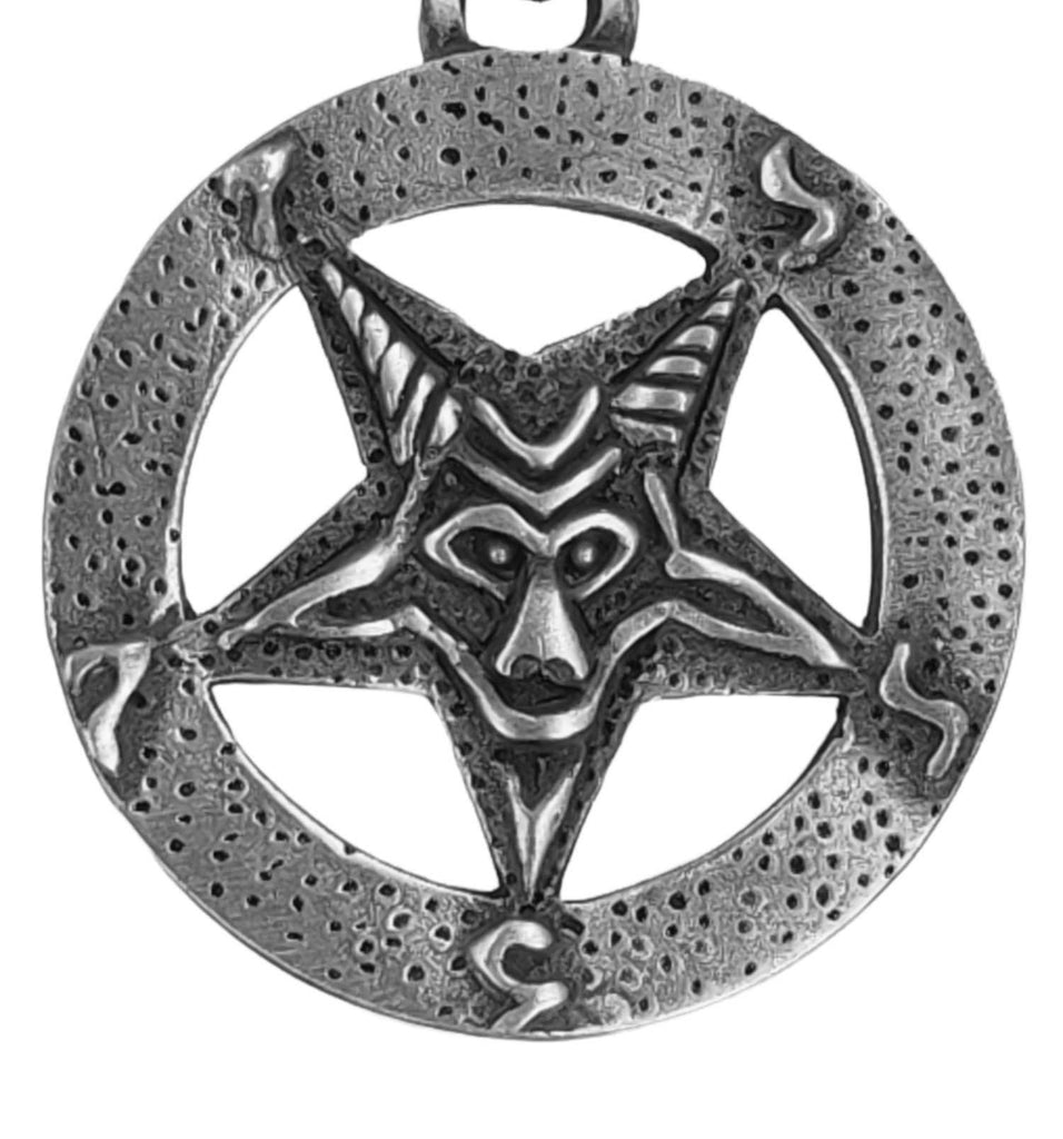 Kunstvoll gestalteter Anhänger aus Zinn/Pewter, Motiv "Baphomet". Der Kettenanhänger ist teilweise geschwärzt. Das Pentagramm ist von einem breiten Ring umgeben.