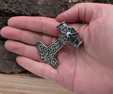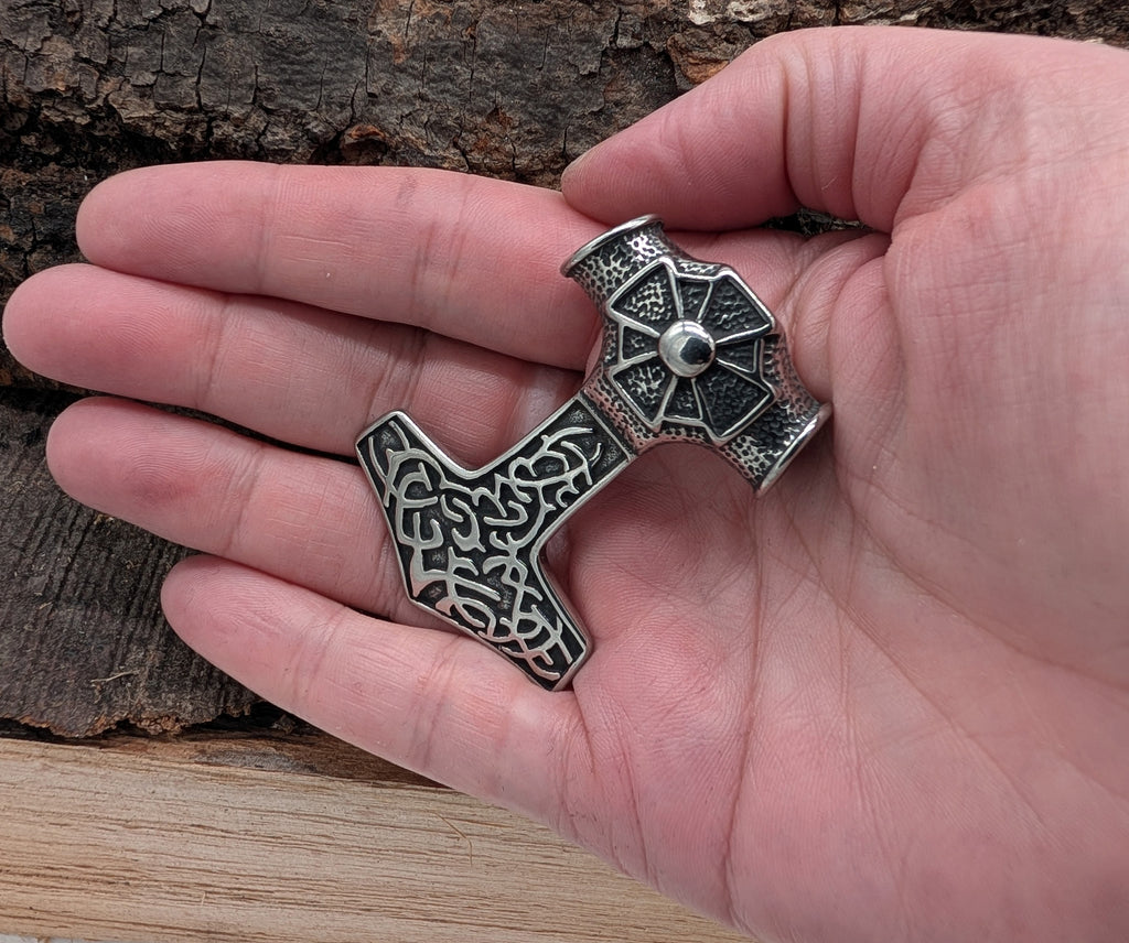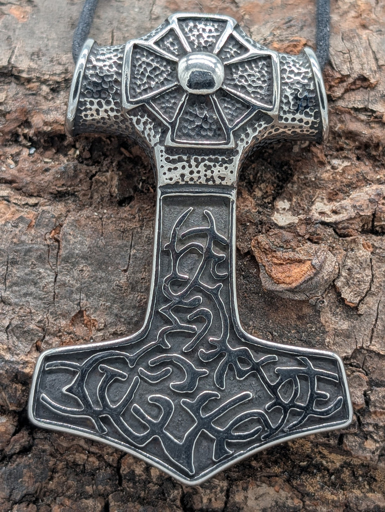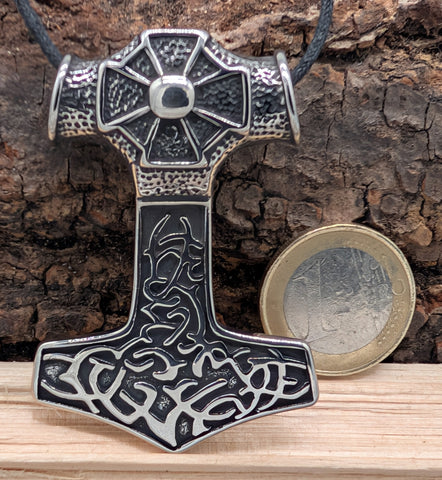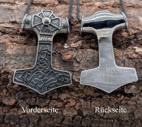 Großer, massiver, aufwändig verarbeiteter Kettenanhänger "Thorshammer" aus Edelstahl mit großer Öse. Der Schmuckanhänger ist auf Rückseite glatt kunstvoll verziert und teilweise geschwärzt, lässt sich also beidseitig tragen. Ein Eisernes Kreuz dient als Blickfang auf der Öse.