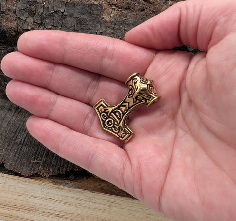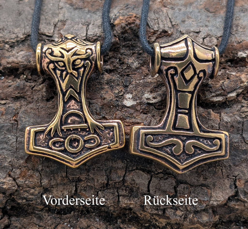Schwerer, hochwertig verarbeiteter Kettenanhänger "Thorshammer" aus Bronze. Der Hammer ist auf beiden Seiten kunstvoll verziert.