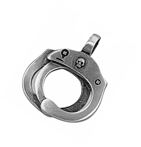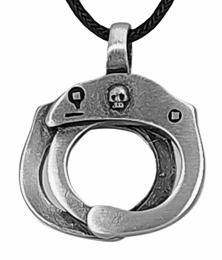 Kunstvoll gestalteter Anhänger aus Zinn/Pewter, Motiv "Handschellen". Der Kettenanhänger ist teilweise geschwärzt.