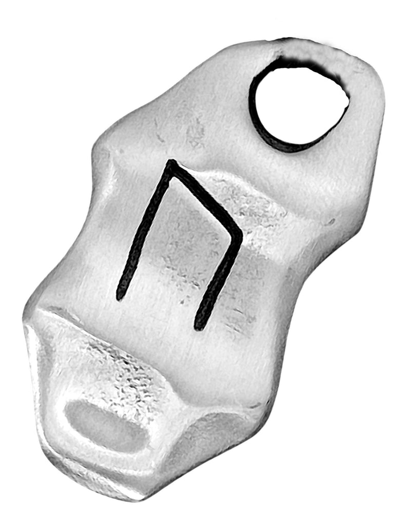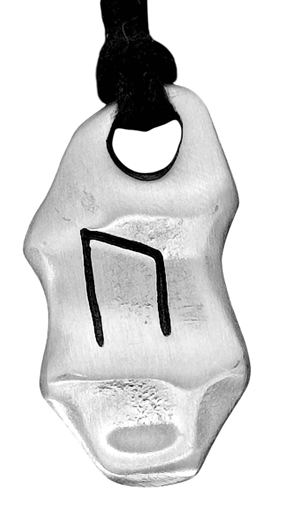 Kunstvoll gestaltetes Amulett aus Zinn mit eingravierter Uruz-Rune auf der Vorderseite. Die Rückseite des Kettenanhängers ist glatt poliert.