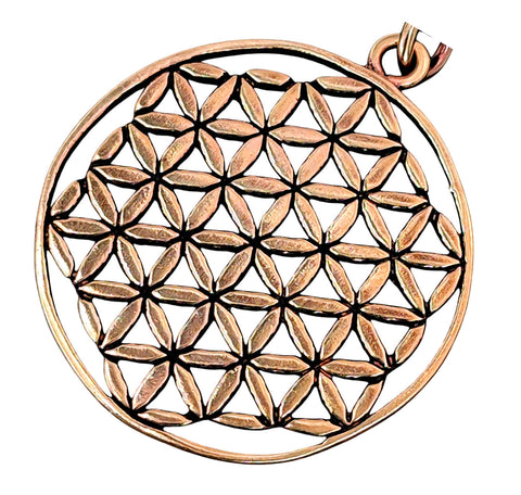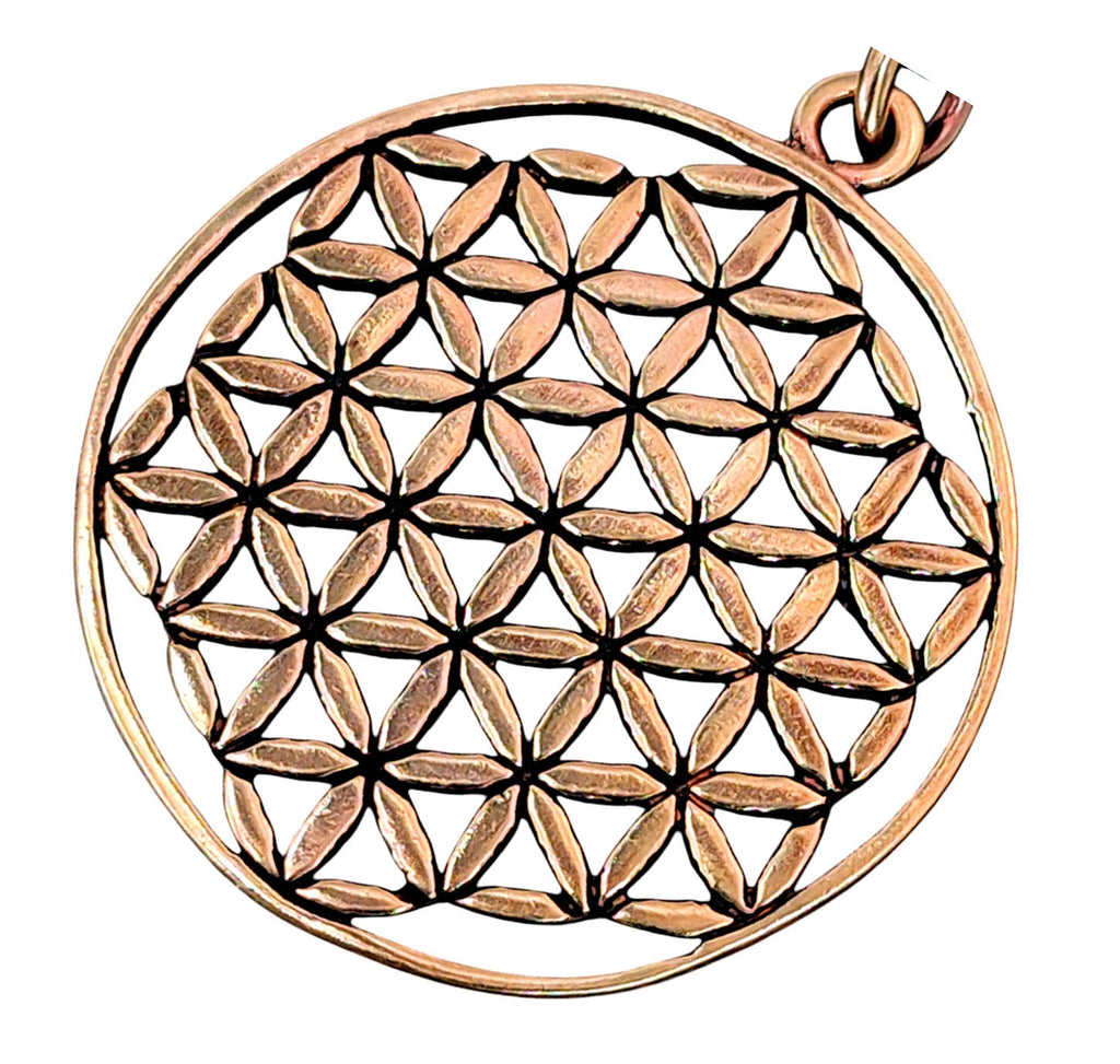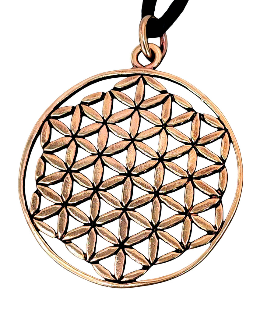 Große, kunstvoll gestaltete Blume des Lebens aus Bronze. Der Kettenanhänger ist teilweise geschwärzt.