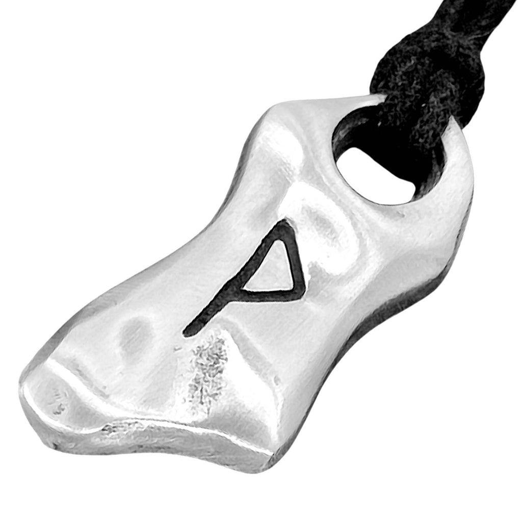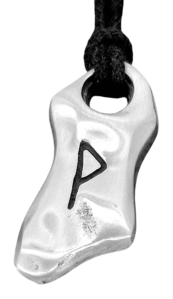Kunstvoll gestaltetes Amulett aus Zinn mit eingravierter Wunjo-Rune auf der Vorderseite. Die Rückseite des Kettenanhängers ist glatt poliert.