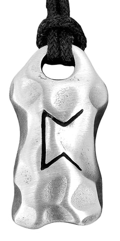 Kunstvoll gestaltetes Amulett aus Zinn mit eingravierter Perthro-Rune auf der Vorderseite. Die Rückseite des Kettenanhängers ist glatt poliert.