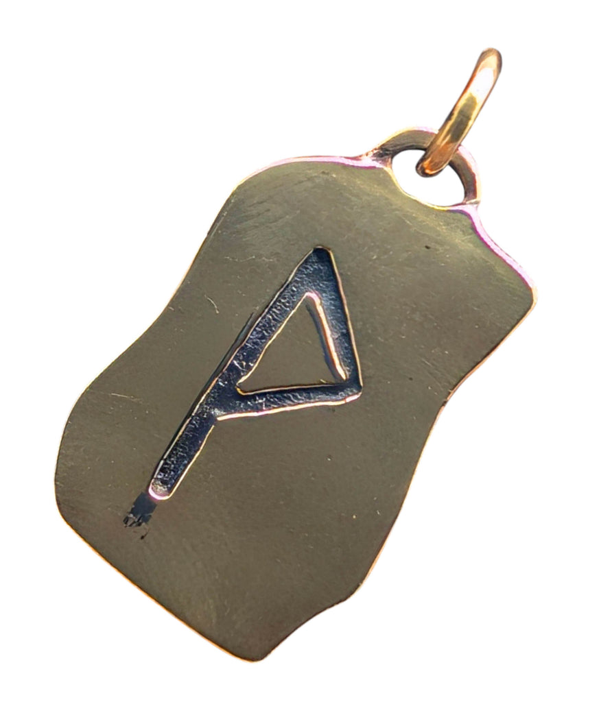 Kunstvoll gestaltetes Amulett aus Bronze mit eingravierter Wunjo-Rune auf der Vorderseite. Die Rückseite ist glatt poliert.