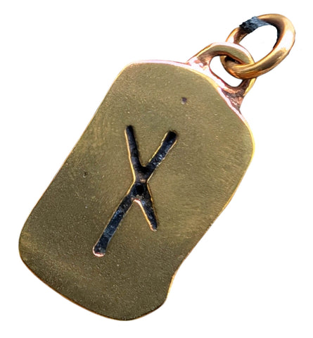 Kunstvoll gestaltetes Amulett aus Bronze mit eingravierter Nauthiz-Rune auf der Vorderseite. Die Rückseite ist glatt poliert.