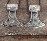 Große, schwere, kunstvoll gestaltete Wikingeraxt aus Edelstahl. Die Axt ist mit diversen Keltenknoten sowie der Dagaz-Rune verziert.