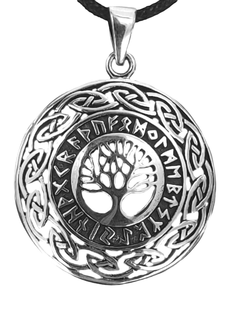 Der Kettenanhänger ist auf der Vorderseite teilweise geschwärzt, sodass das kunstvolle Design optimal zur Geltung kommt. Den Baum umgeben ein Runenkreis und ein Ring aus Keltenknoten.