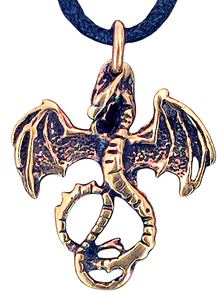 Kunstvoll gestalteter Drache aus Bronze. Der Kettenanhänger ist teilweise geschwärzt, sodass die sorgfältig ausgearbeiteten Details optimal zur Geltung kommen.