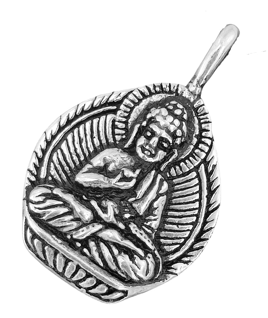 Kunstvoll gestalteter Buddha-Anhänger aus 925 Sterling Silber. Der Kettenanhänger ist auf der Vorderseite teilweise geschwärzt, die Rückseite ist glatt poliert.
