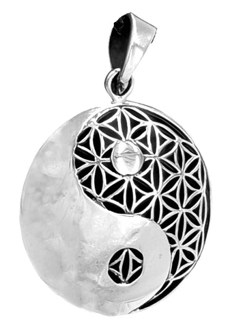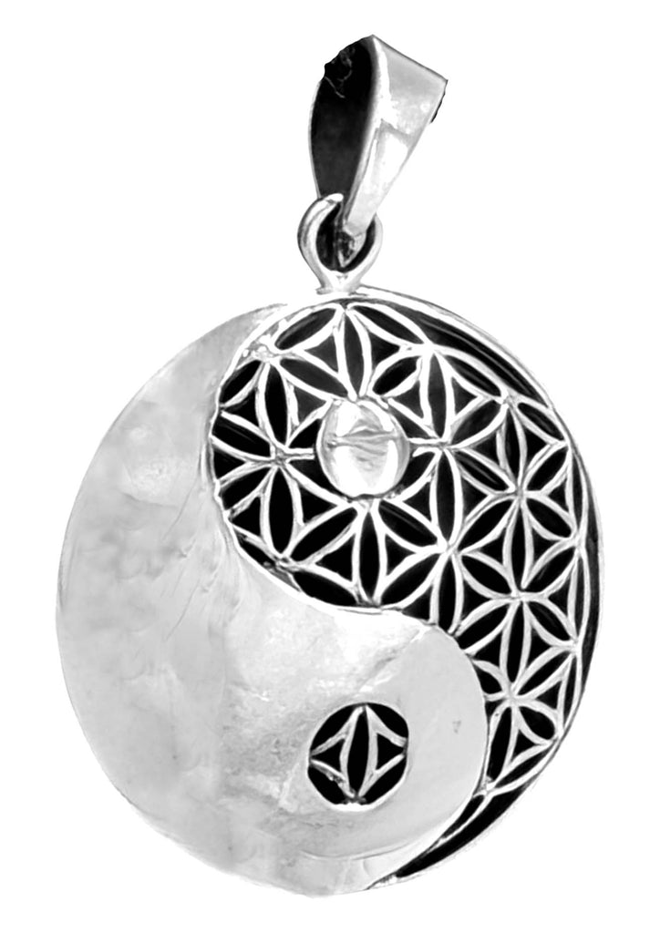 Kunstvoll gestaltete Kombination aus Yin & Yang und Blume des Lebens aus 925 Sterling Silber. Der Kettenanhänger ist glatt poliert.