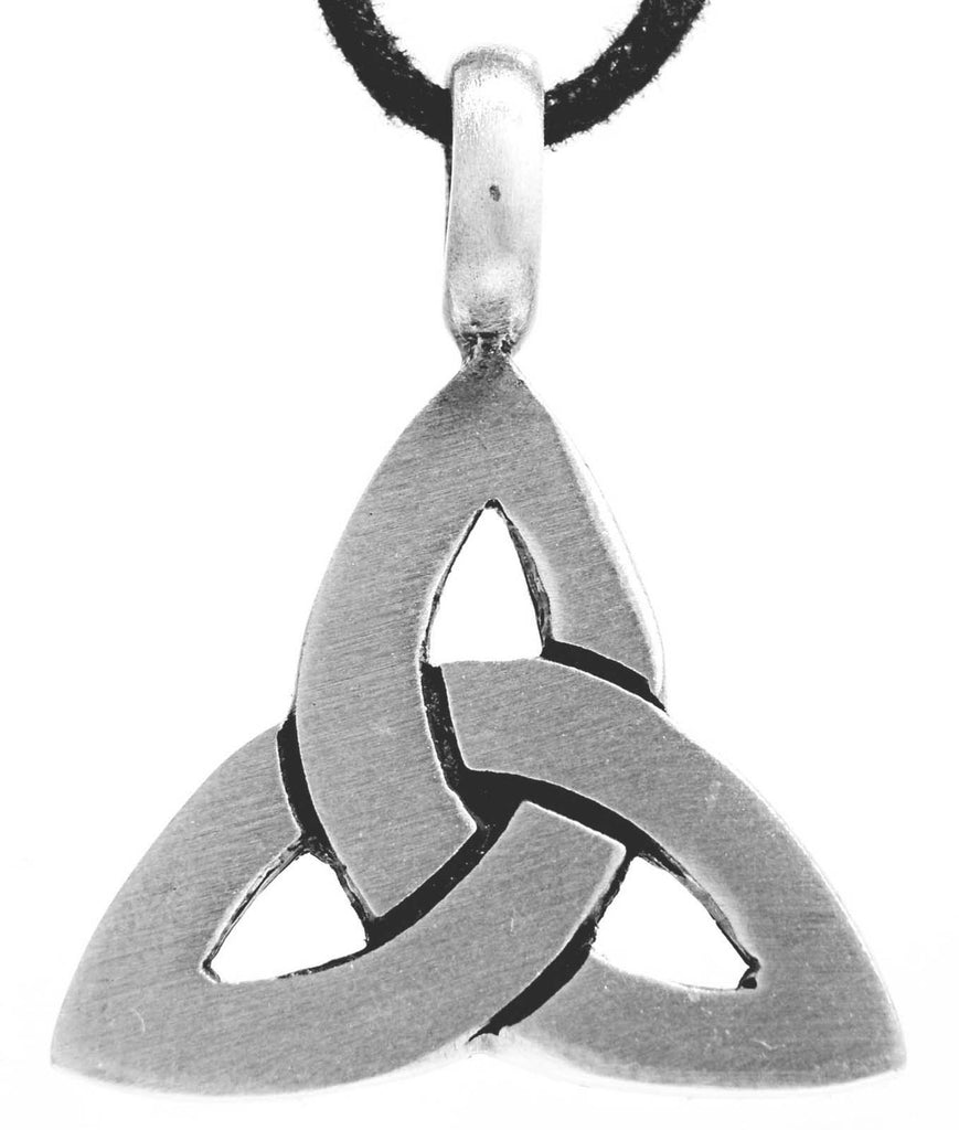 Kunstvoll gestalteter Anhänger aus Zinn/Pewter, Motiv "Triqueta-Knoten". Der Kettenanhänger ist teilweise geschwärzt.