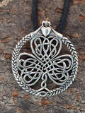 Kunstvoll gestalteter Shamrock-Anhänger aus 925 Sterling Silber, gestempelt. Die Öse befindet sich auf der Rückseite des Kleeblatts. Das Kleeblatt weist ein schönes Knotenmuster auf und und ist oben mit einem kleinen Claddagh-Motiv verziert. Der Kettenanhänger ist auf der Vorderseite teilweise geschwärzt, die Rückseite ist glatt poliert.