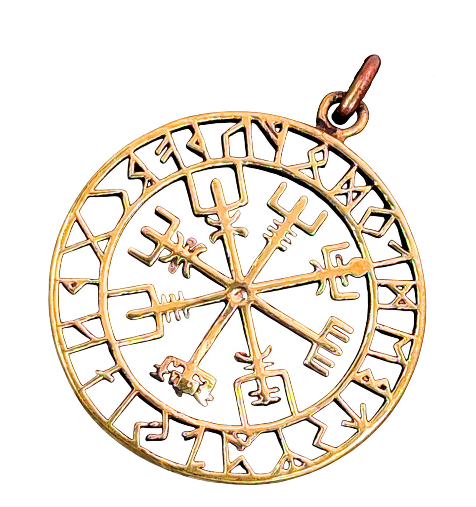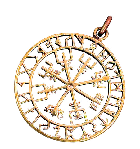 Kunstvoll gestalteter Kettenanhänger "Wikingerkompass" aus Bronze. Der Anhänger ist glatt poliert. Den Kompass umgibt ein Runenring. Für Damen und Herren.