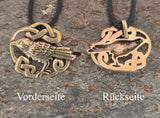 Kunstvoll gestalteter Rabenanhänger aus Bronze. Der Vogel ist in ein fantasievolles Knotenmuster eingebettet, was ihm einen dezent keltischen Touch verleiht.