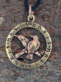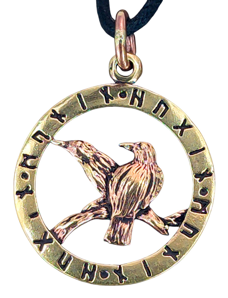 Kunstvoll gestalteter Raben-Anhänger aus Bronze. Die beiden Vögel umgibt ein Ring mit den eingravierten Namen "Hugin" und "Munin" in Runenschrift. Der Kettenanhänger ist auf der Vorderseite teilweise geschwärzt. Für Damen und Herren.