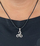 Zierliche, schön geschwungene Triskele aus 925 Sterling Silber. In der Mitte des Anhängers bilden die kunstvollen Stränge der Dreierspirale zusätzlich einen Triqueta-Knoten. Der Kettenanhänger ist auf der Vorderseite teilweise geschwärzt.