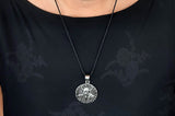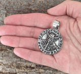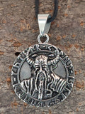 Kunstvoll gestaltetes Wikinger Amulett aus Edelstahl. Das Portrait des Kriegers ist von einem Ring aus Runen umgeben. Auf der Rückseite ist ein Wotansknoten abgebildet.