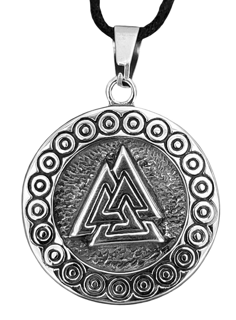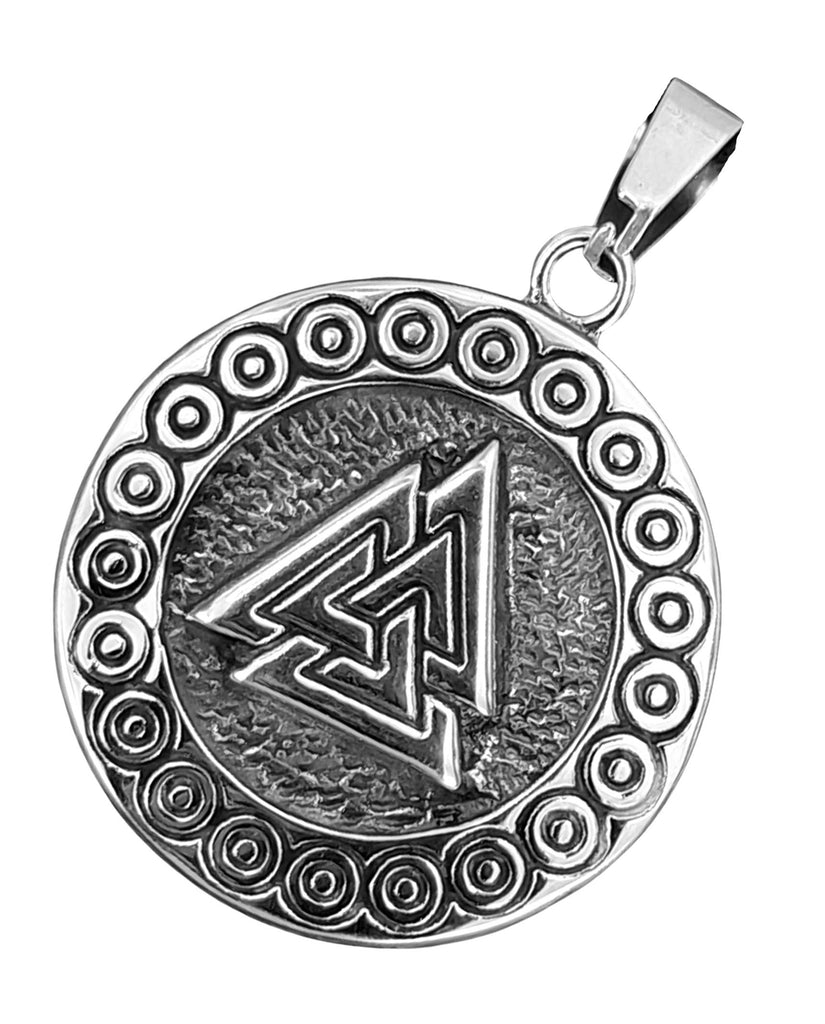 Kunstvoll gestalteter Wotansknoten aus Edelstahl. Das Hauptmotiv umgibt ein Ring mit sorgfältig ausgeführtem Kreismuster.