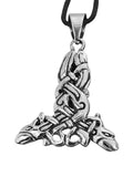 Kunstvoll gestalteter keltischer Knoten aus Edelstahl, mit zwei Wolfsköpfen verziert. Die Vorderseite des Kettenanhängers ist teilweise geschwärzt, die Rückseite ist glatt poliert.