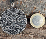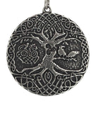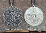 Dieser Schmuckanhänger vereint zahlreiche Motive aus der nordischen Mythologie. Das zentrale Element stellt dabei der Lebensbaum Yggdrasil dar. Seine Wurzeln und Zweige bilden ein filigranes Knotenmuster. In der Mitte des Stammes befindet sich eine Triskele. Auf einem Ast des Baumes sitzen Odins Raben Hugin und Munin. Im Hintergrund reitet der Göttervater auf seinem achtbeinigen Pferd Sleipnir vorbei.