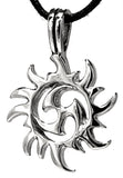 Originell gestalteter Triskelen-Anhänger aus Edelstahl. Das Hauptmotiv ist von einem Kranz aus Sonnenstrahlen umgeben. Der Kettenanhänger ist glatt poliert.