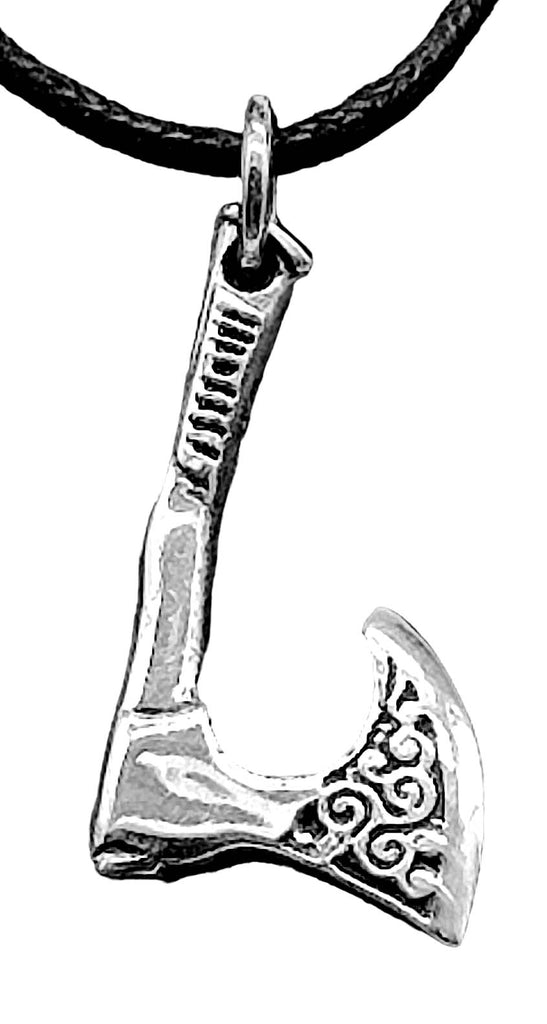 Die geschwärzten Bereiche heben bestimmte Teile der Verzierungen hervor und verleihen dem Beil einen kontrastreichen, fesselnden Look. Die sorgfältige Gestaltung der Axt verleiht dem Schmuckstück eine kraftvolle und zugleich ästhetische Ausstrahlung.