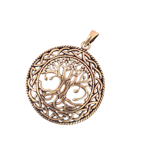 Großer, kunstvoll gestalteter Schmuckanhänger "Lebensbaum" aus Bronze. Der Anhänger ist auf der Vorderseite teilweise geschwärzt, sodass das filigrane Geflecht der Wurzeln und Äste optimal zur Geltung kommt. Den Baum umgibt ein Ring aus Keltenknoten. Für Damen und Herren.