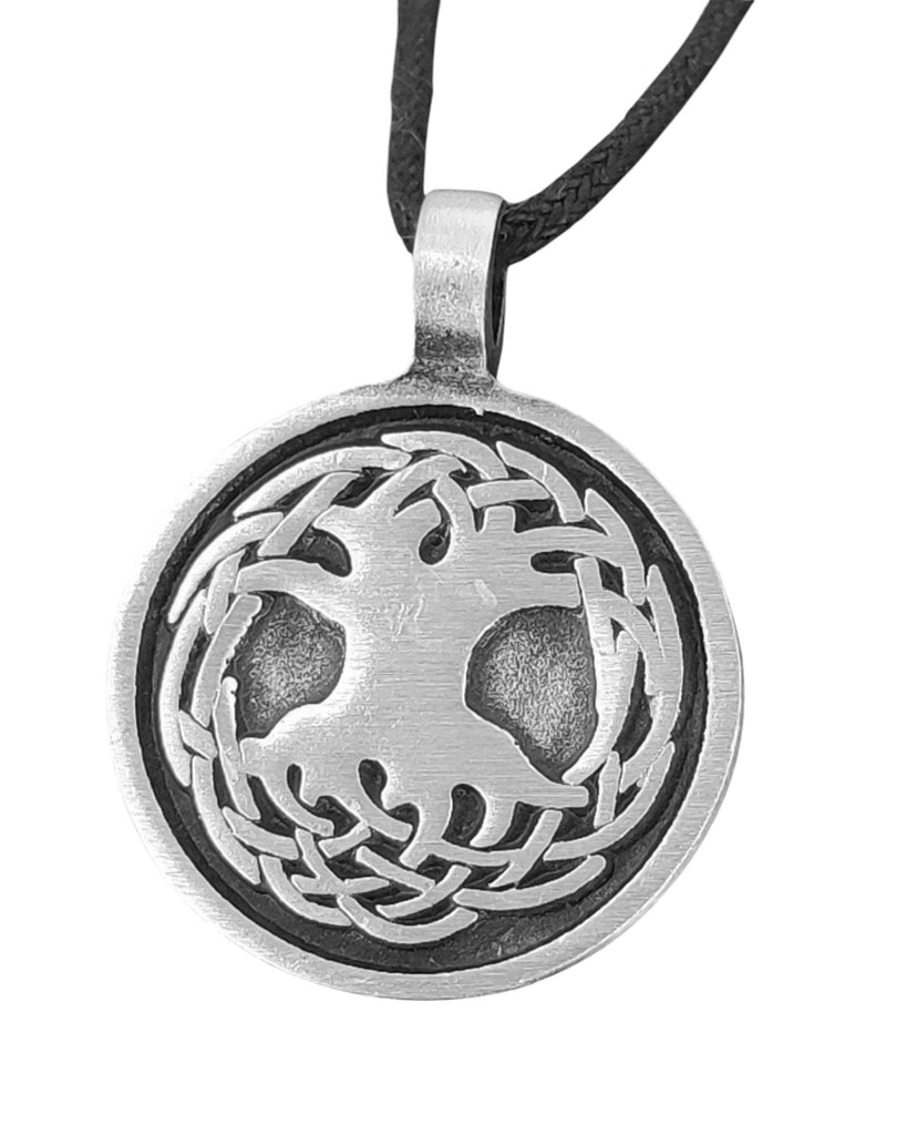 Detailreich gestaltetes Lebensbaum-Amulett aus Zinn. Äste und Wurzeln bilden ein kunstvolles Knotenmuster. Der Schmuckanhänger ist auf der Vorderseite teilweise geschwärzt, sodass das Design optimal zur Geltung kommt.
