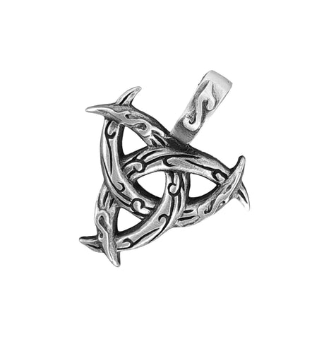 Kunstvoll gestalteter Kettenanhänger aus Zinn/Pewter. Die Bedeutung des Motivs liegt im Auge des Betrachters: Wer hier drei verschlungene Methörner sieht, hat ein schönes Symbol des nordischen Göttervaters vor sich: Odins Horn. Wem das nicht zusagt, kann das Schmuckstück auch als eine Kombination aus drei Mondsicheln interpretieren.