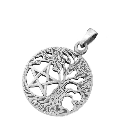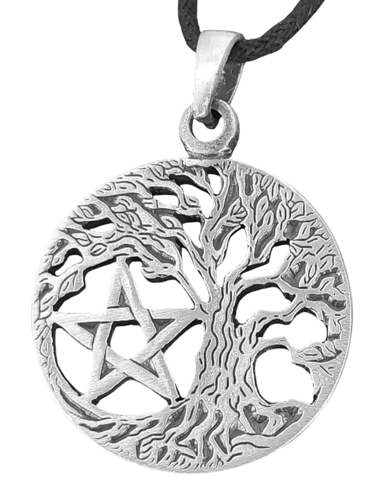 Kunstvoll gestaltete Kombination aus Lebensbaum und Pentagramm aus Zinn. Der Schmuckanhänger ist auf der Vorderseite teilweise geschwärzt, sodass das filigrane Design optimal zur Geltung kommt.