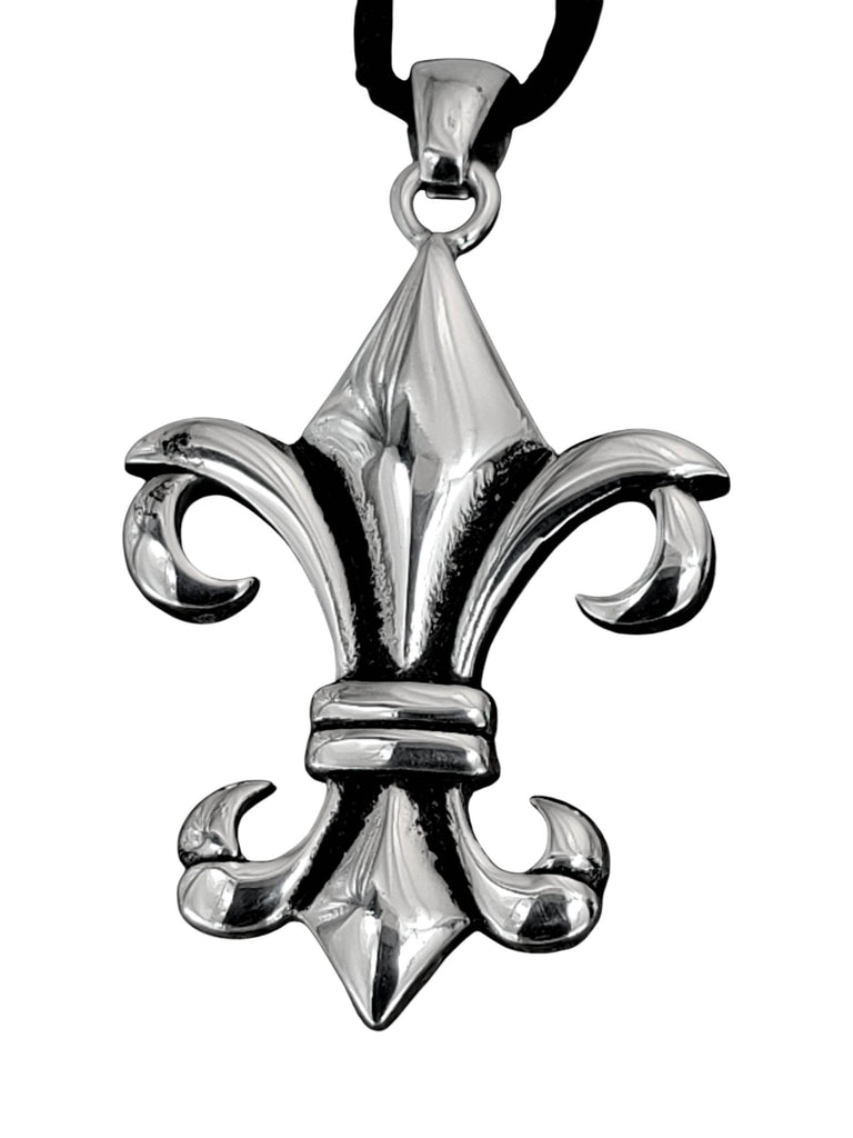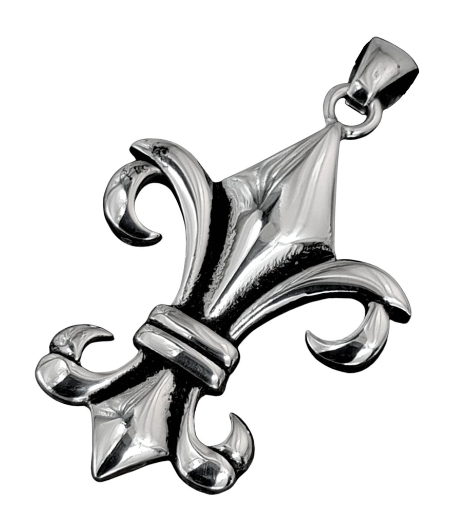 Kunstvoll gestalteter Fleur-de-Lis-Anhänger aus Edelstahl. Der Kettenanhänger ist auf der Vorderseite teilweise geschwärzt, die Rückseite ist glatt poliert.