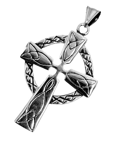 Aufwändig verarbeitetes Keltenkreuz aus Edelstahl. Der Anhänger ist auf Vorder- und Rückseite gleichermaßen kunstvoll verziert und teilweise geschwärzt.